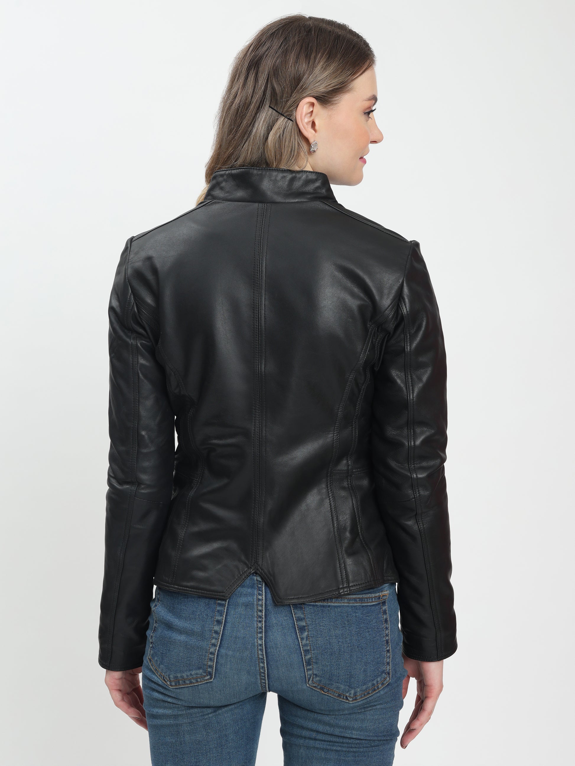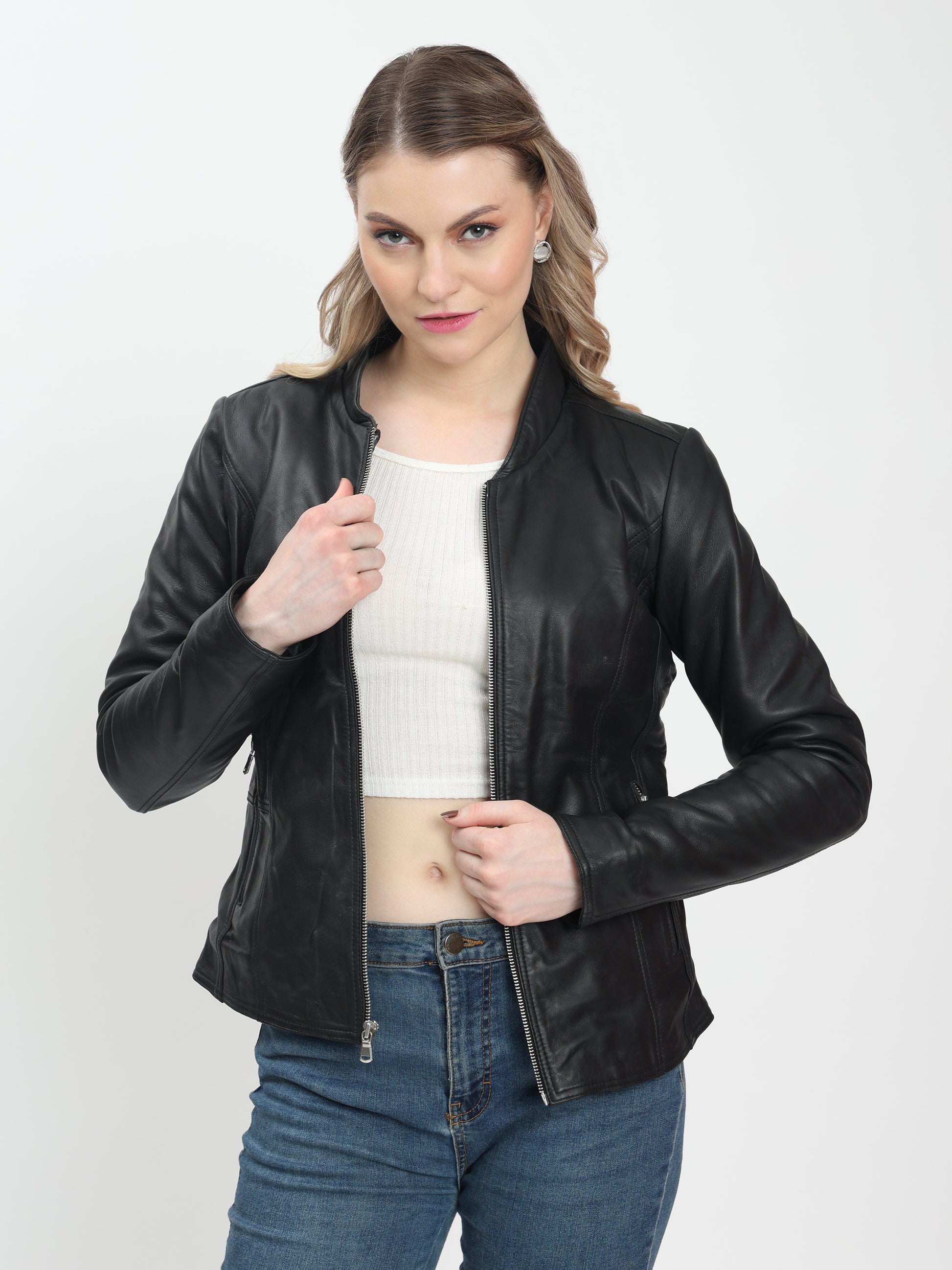 Refined and effortlessly stylish, the Celestia Jacket is designed for modern elegance. Featuring a sleek zip-front closure and a softly structured stand collar, this jacket is tailored to flatter with its sculpted paneling and feminine silhouette. Made up of genuine lambskin, it offers a naturally soft, smooth feel with a graceful drape that enhances comfort and wearability.
