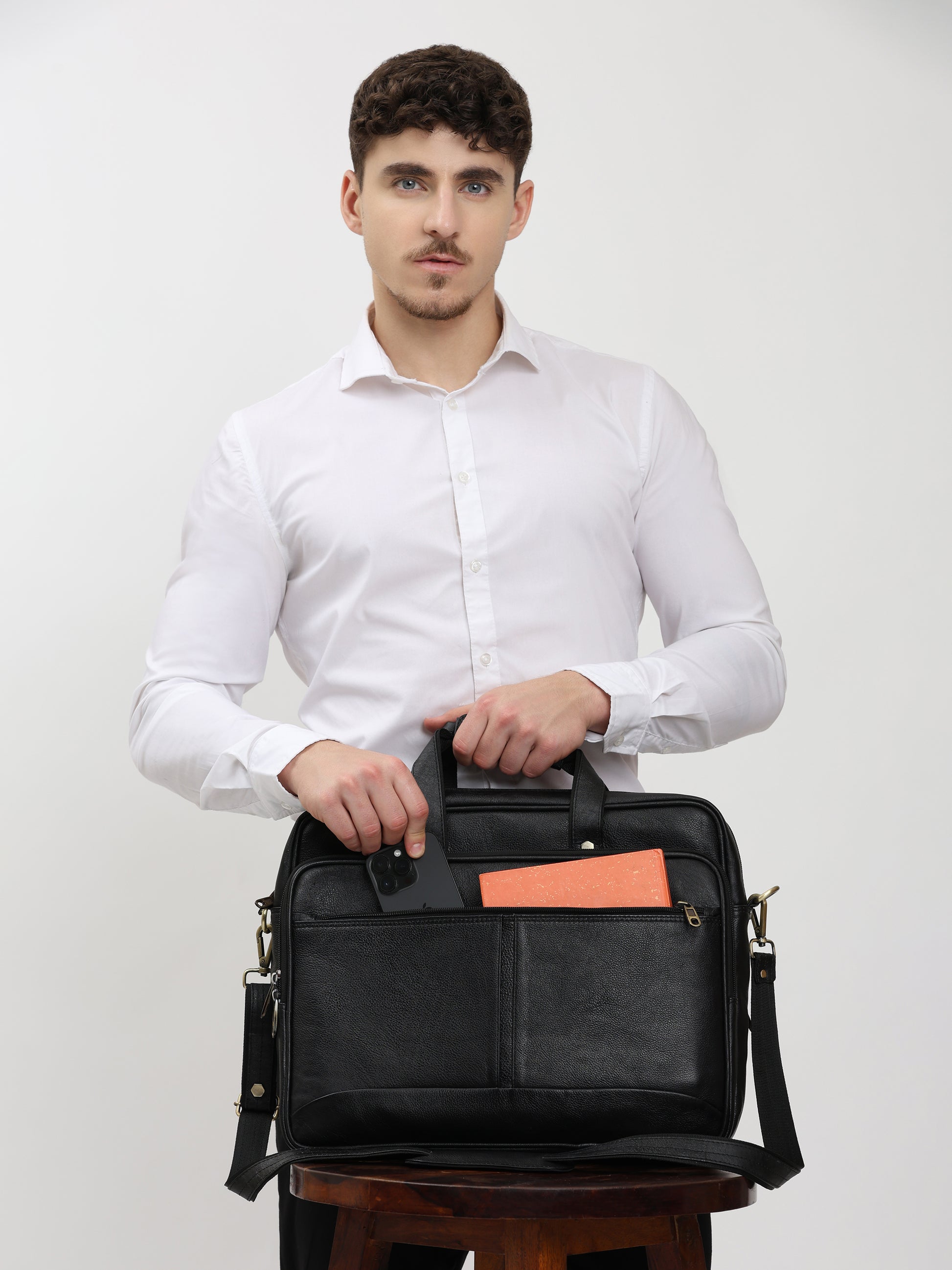 Crafted from premium heritage leather, this messenger bag seamlessly transitions from office to travel with refined sophistication. The spacious main compartment securely accommodates laptops up to 15 inches, while dedicated pockets organize documents, accessories, and essentials. Reinforced stitching and quality hardware ensure durability through years of daily use. The adjustable shoulder strap distributes weight evenly for comfortable carrying, and the structured silhouette maintains its shape whether full or empty. Rich black leather develops a distinguished patina over time, making each bag uniquely yours. An investment piece that combines professional aesthetics with practical functionality.